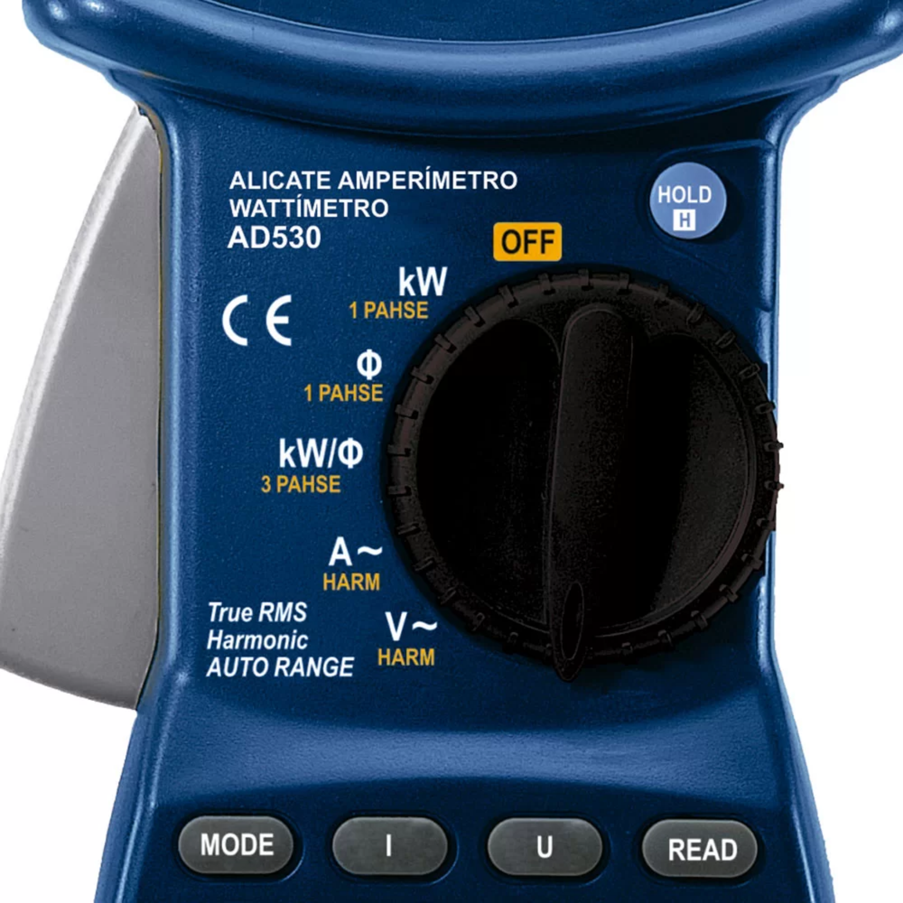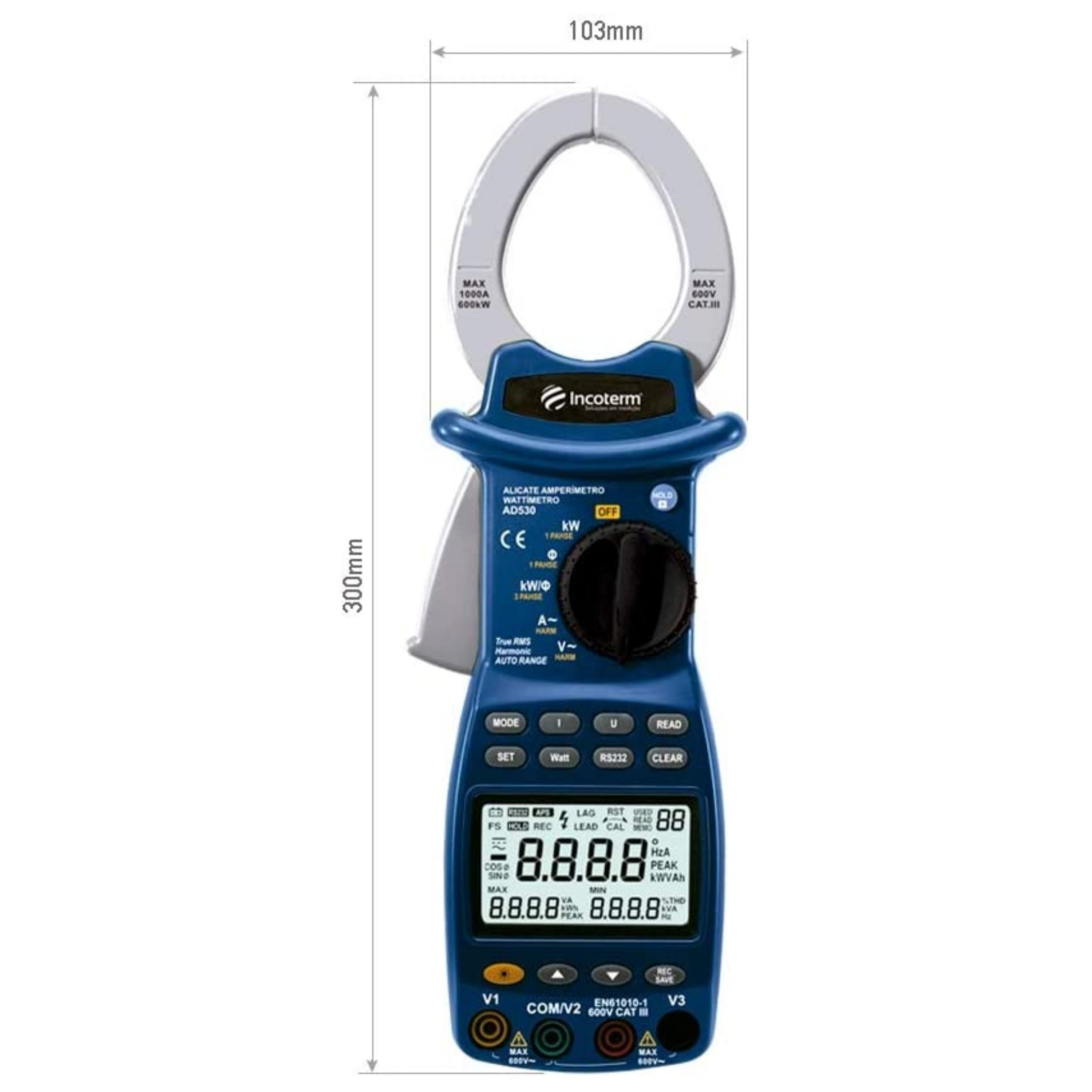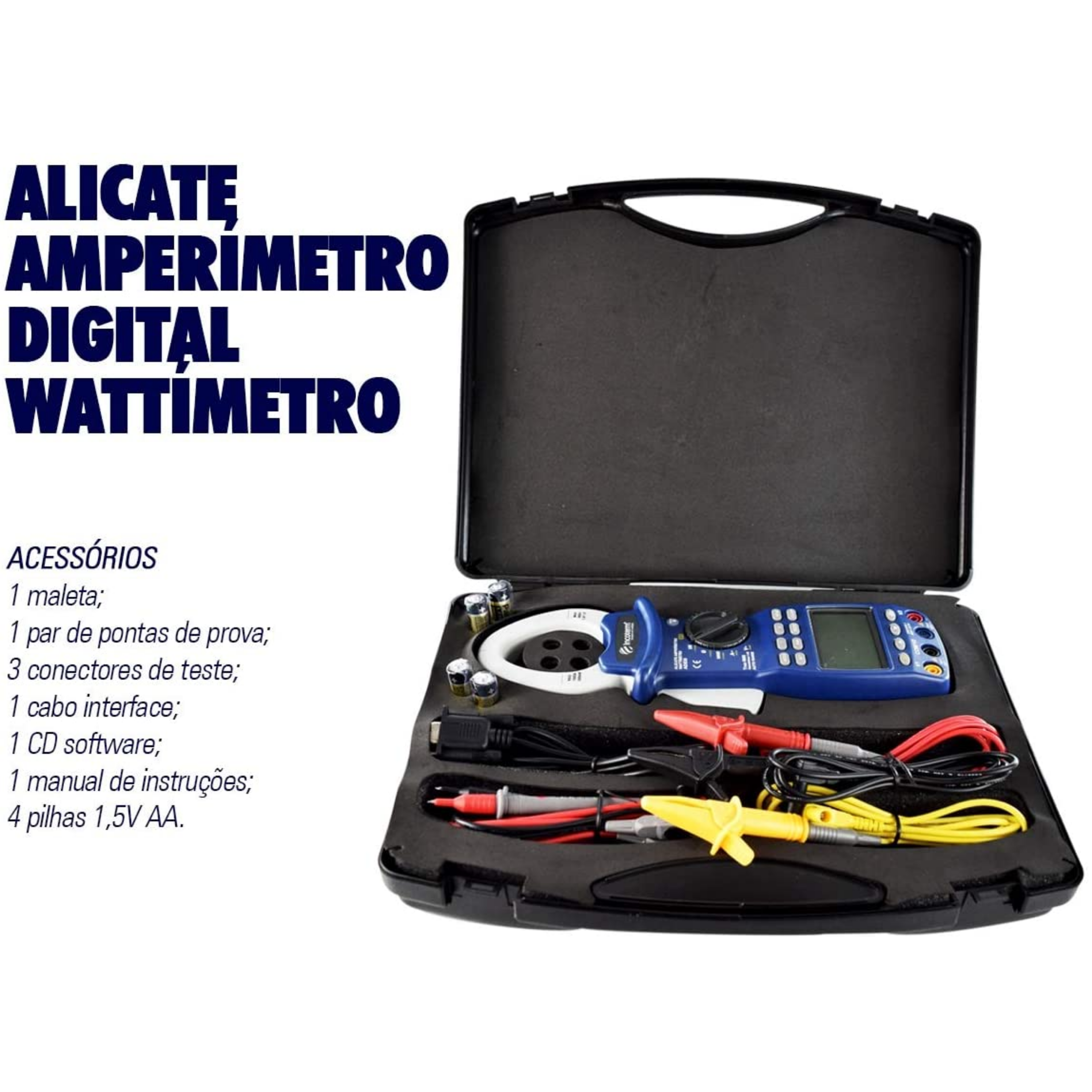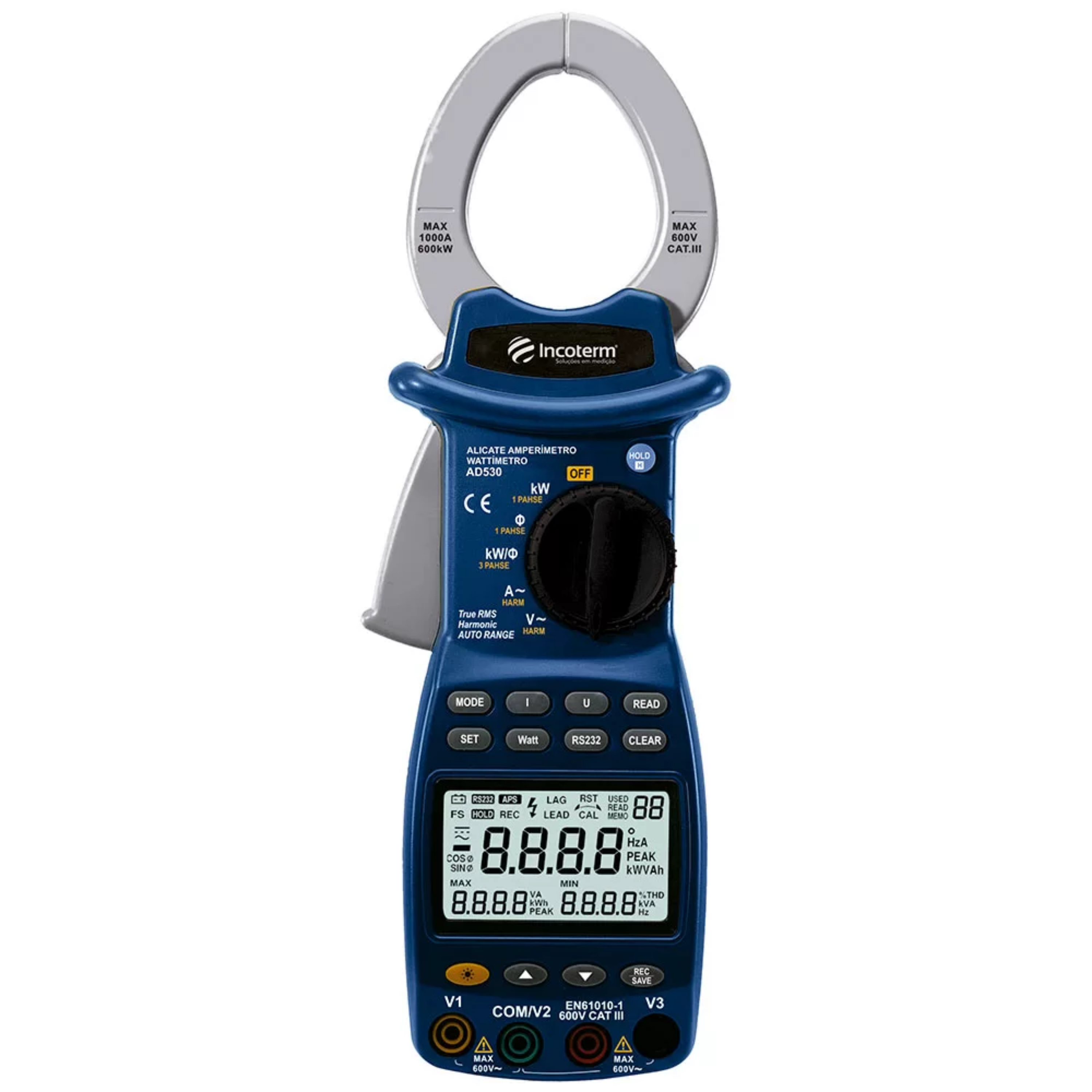 Medição de: Tensão AC | Corrente AC | Frequência | Potência Ativa | Potência Aparente | Potência Reativa | Fator de Potência | Harmônicas