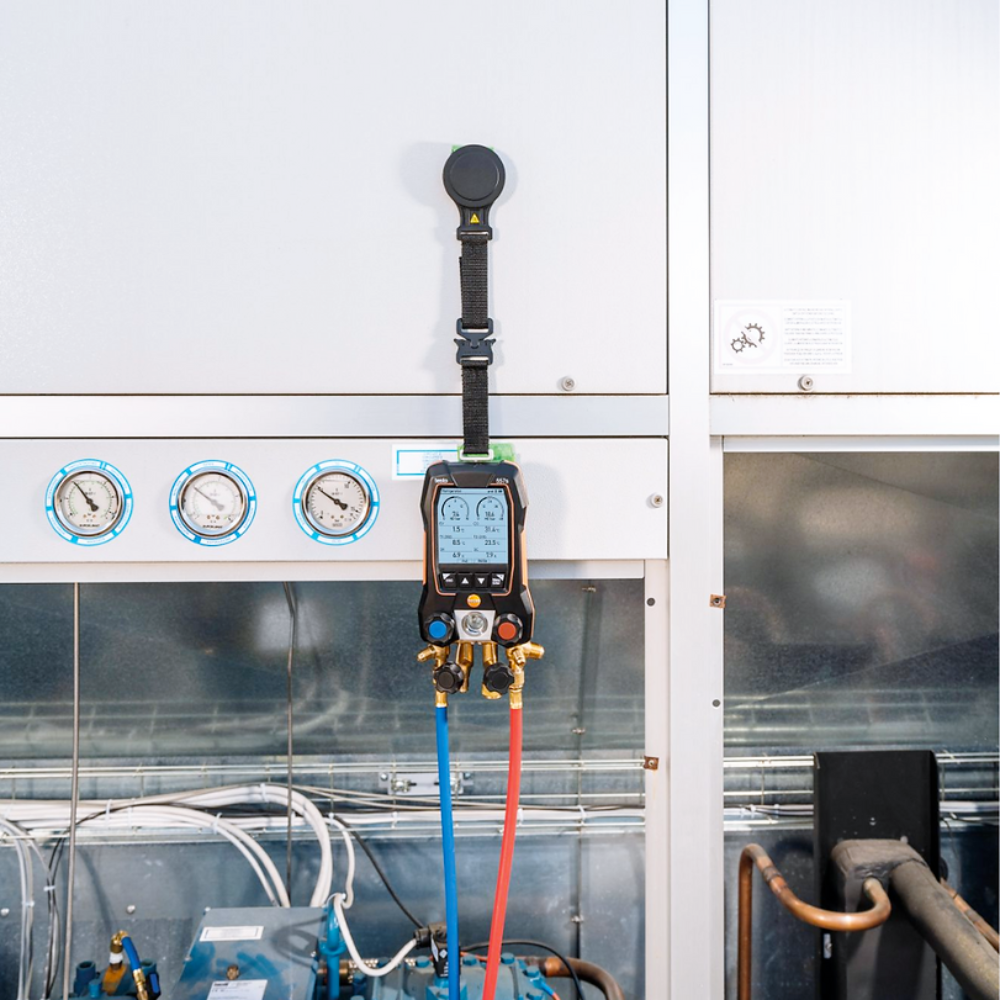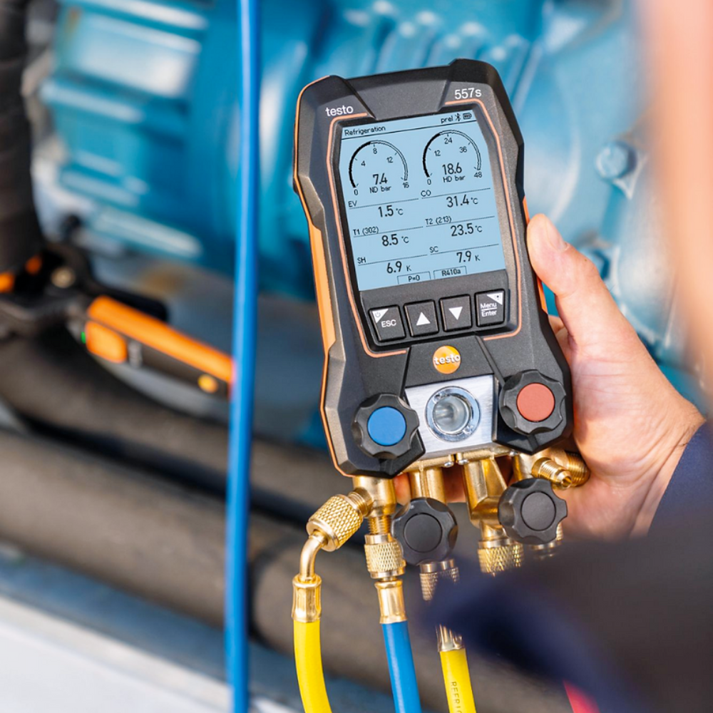 - Manifold digital inteligente testo 557s com Bluetooth e bloco de válvulas de 4 vias, 1 sonda de vácuo sem fio testo 552i (Bluetooth), 2 sondas de temperatura de pinça sem fio testo 115i (Bluetooth, NTC), conjunto de enchimento de mangueiras com 4 mangueiras.