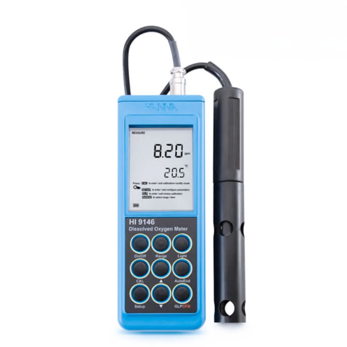 - Informações Adicionais: HI9146-04 é fornecido completo com sonda de OD HI76407 com cabo de 4 m, membranas de OD pré-formada de PTFE (2), solução eletrolítica HI7041S (30 mL), baterias, instruções e maleta de transporte.