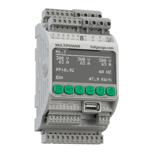 Multi-medidor e gerenciador de energia elétrica que realiza medições instantâneas de: tensão, corrente, frequência, potência ativa, aparente, reativa e fator de potência. Também mede e registra medições cumulativas como: consumo total, energia ativa total, energia reativa total, energia aparente total, demanda de potência ativa, demanda de potência reativa e demanda de potência aparente. O MultiPower executa a medição de tensão de forma direta e a de corrente através de transformadores de corrente (TC) externos.