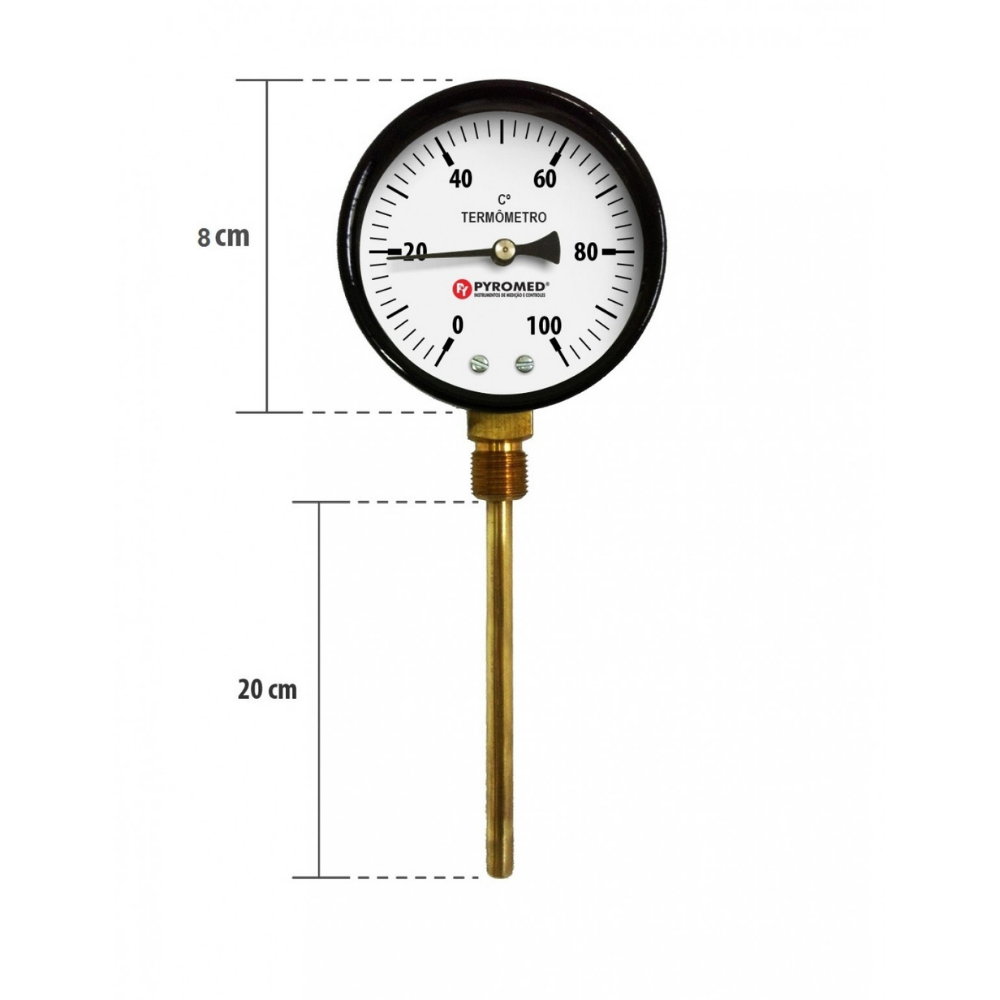 Termômetro bimetálico industrial para medição de temperatura de ar, água, óleo, gases, vapor, líquidos e outros fluídos.